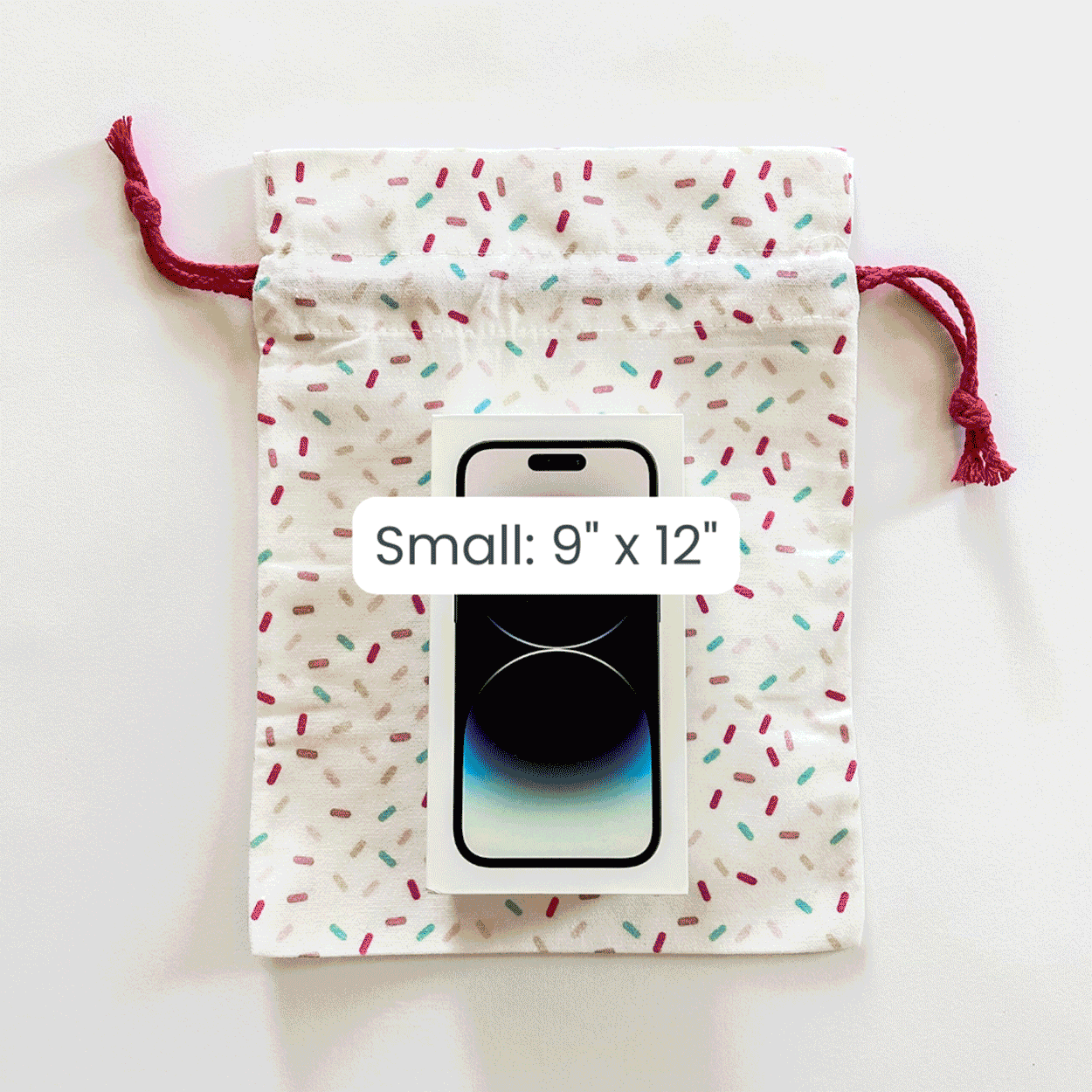 Our small bag measures 9" x 12" and can fit small gifts like candles, coffee mugs, and stocking stuffers.