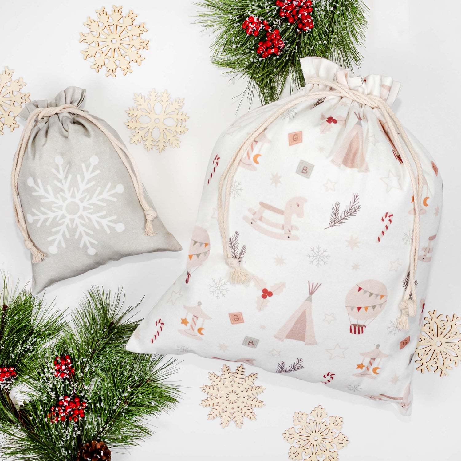 Deck the halls with our Boho Toy Christmas fabric gift bag! Complete with a coordinating snowflake print in warm beige and creamy tones, it's the perfect package for spreading festive cheer. Say goodbye to the chaos of traditional wrapping and hello to effortless style and convenience.