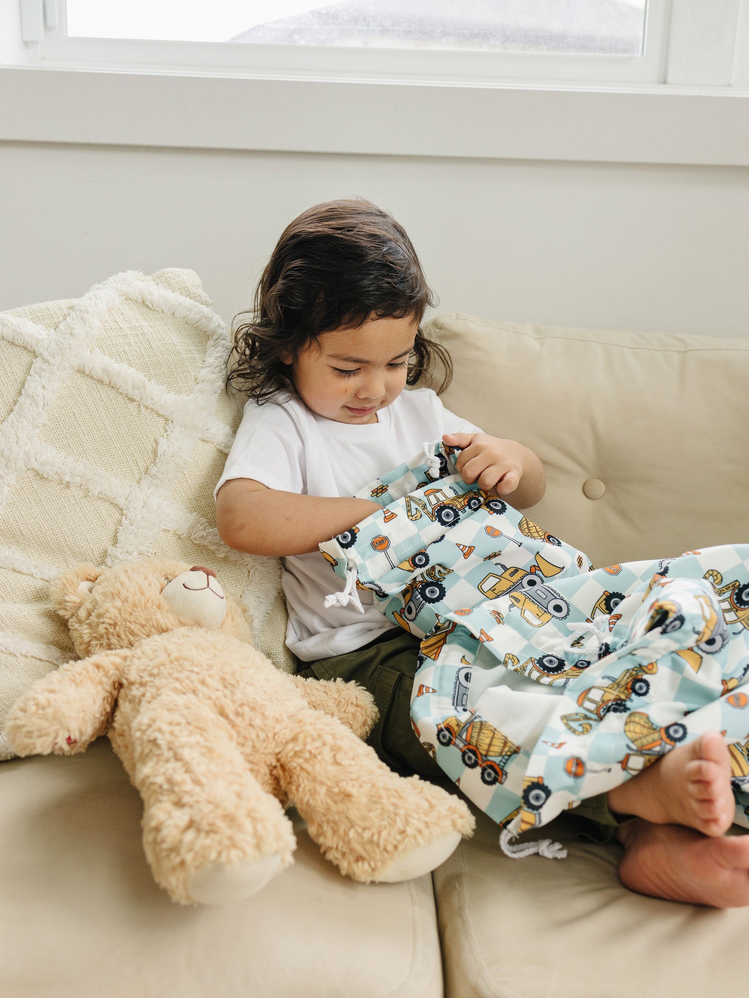 Get ready to build excitement with the Construction fabric gift bag! Featuring bold yellow construction trucks on a playful blue-and-white checkered background, this high-quality fabric bag is perfect for the little (or big!) builders in your life. Made from thick, wrinkle-resistant fabric, this vibrant bag is as durable as it is fun. The sturdy white rope handles make it easy to carry, while its reusable design saves time and effort.