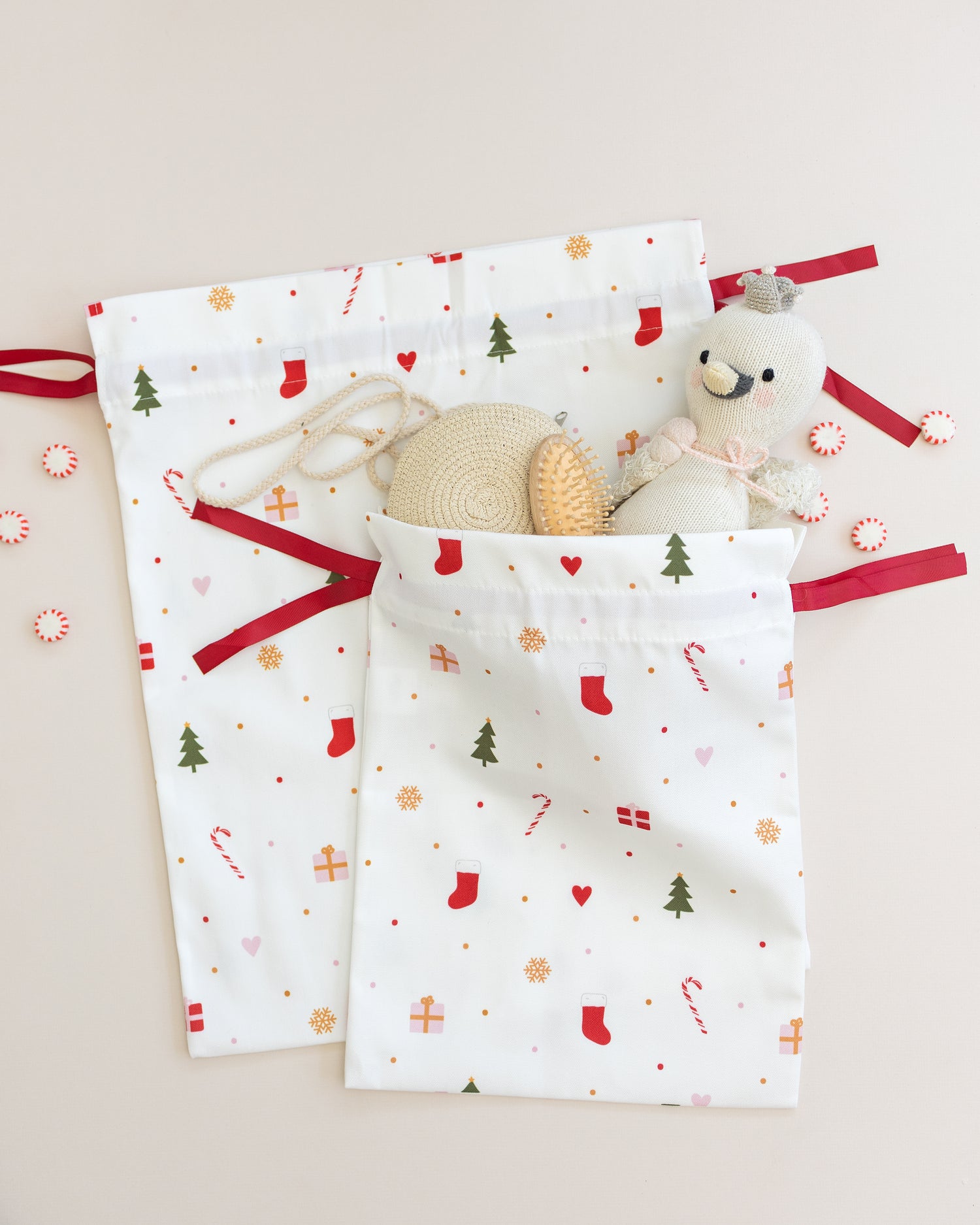 Bring a touch of whimsy to your holiday gifting with our "Holiday Love" fabric gift bag, adorned with playful holiday icons—Christmas trees, hearts, snowflakes, presents, and candy canes—all set against a bright white background. This festive design is sure to delight recipients of all ages!