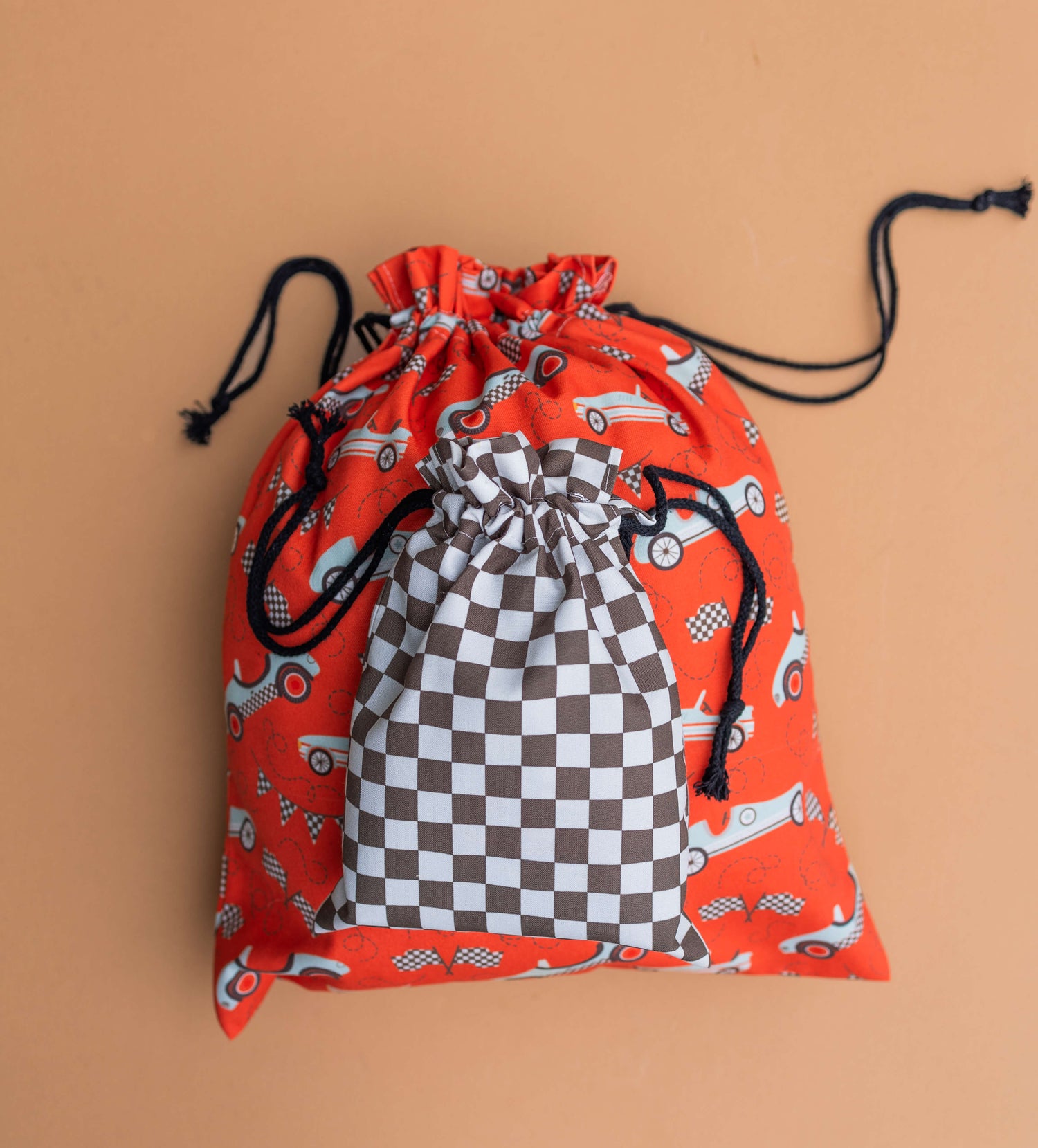 Rev up your gifting game with our Race Car fabric gift bag! Featuring one bag in classic black and white checkered and another in vibrant race car red, this duo is a winning combo for any occasion.
