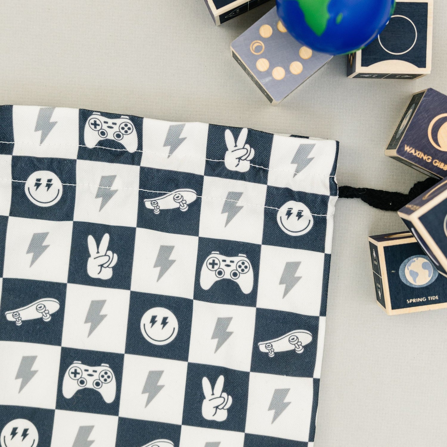 Unwrap the joy with our Radical Vibes Gift Bag, a funky and fabulous way to present your gifts! This black and cream checkered fabric bag is bursting with personality, featuring a playful mix of skateboards, happy faces, thunder bolts, and peace signs. Perfect for birthdays, special occasions, or just spreading some cheer, this bag is as cool as it is cute.